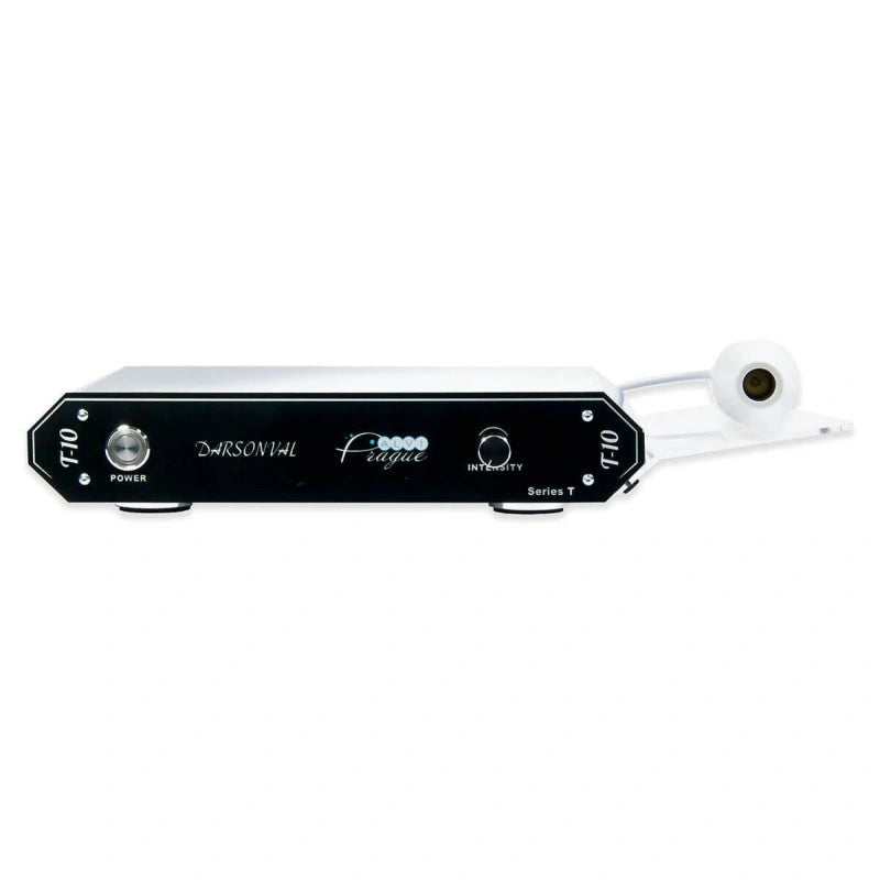 The T-10 is a high-frequency device that features a concise and easy-to-understand control panel. It includes a power button, a rotary regulator to adjust the energy output current, and a light indicating the selected electrical treatment mode.
