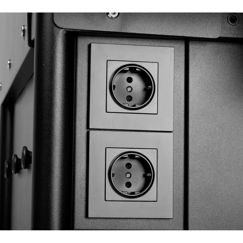 At the front, there are three smaller drawers and a large cabinet for storing equipment and accessories. Additionally, the cabinet and one of the drawers are equipped with steel utensils for added versatility. The vertical drawers feature power and USB outlets on both side walls, and a cable organizer on the back wall. Everything you need during your session is kept organized and within reach in one place.