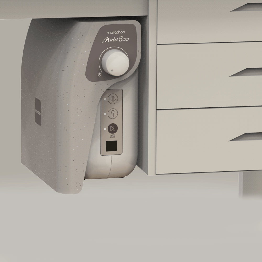 Dispositivo moderno. El torno Saeyang Marathon MULTI800 combina funcionalidad y estética, satisfaciendo las expectativas de los profesionales más exigentes. Con una carcasa futurista en tonos beige y marrón, bordes redondeados y acabado mate, es duradero y fácil de mantener limpio. Además, cuenta con pies de goma para mayor estabilidad y para proteger la superficie contra arañazos. Un elemento elegante para cualquier salón de belleza.