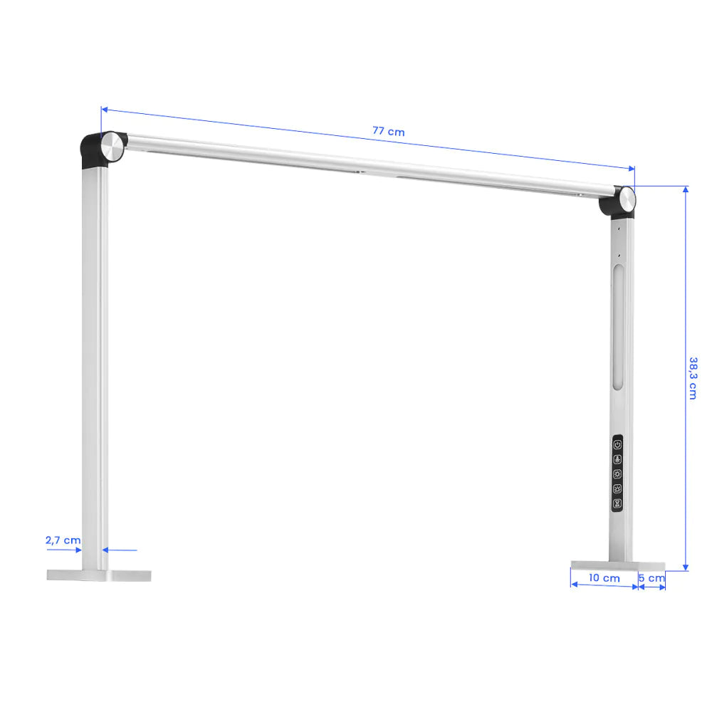 El panel táctil avanzado permite ajustar fácilmente tanto el color (5 niveles de 2800 K a 5400 K) como la intensidad de la luz (5 niveles). La dispersión efectiva de la luz evita deslumbramiento y reduce la fatiga ocular, incluso durante sesiones prolongadas. Además, se puede seleccionar el modo de iluminación (laterales, superior o ambos), ajustando la luz a las necesidades del trabajo.
